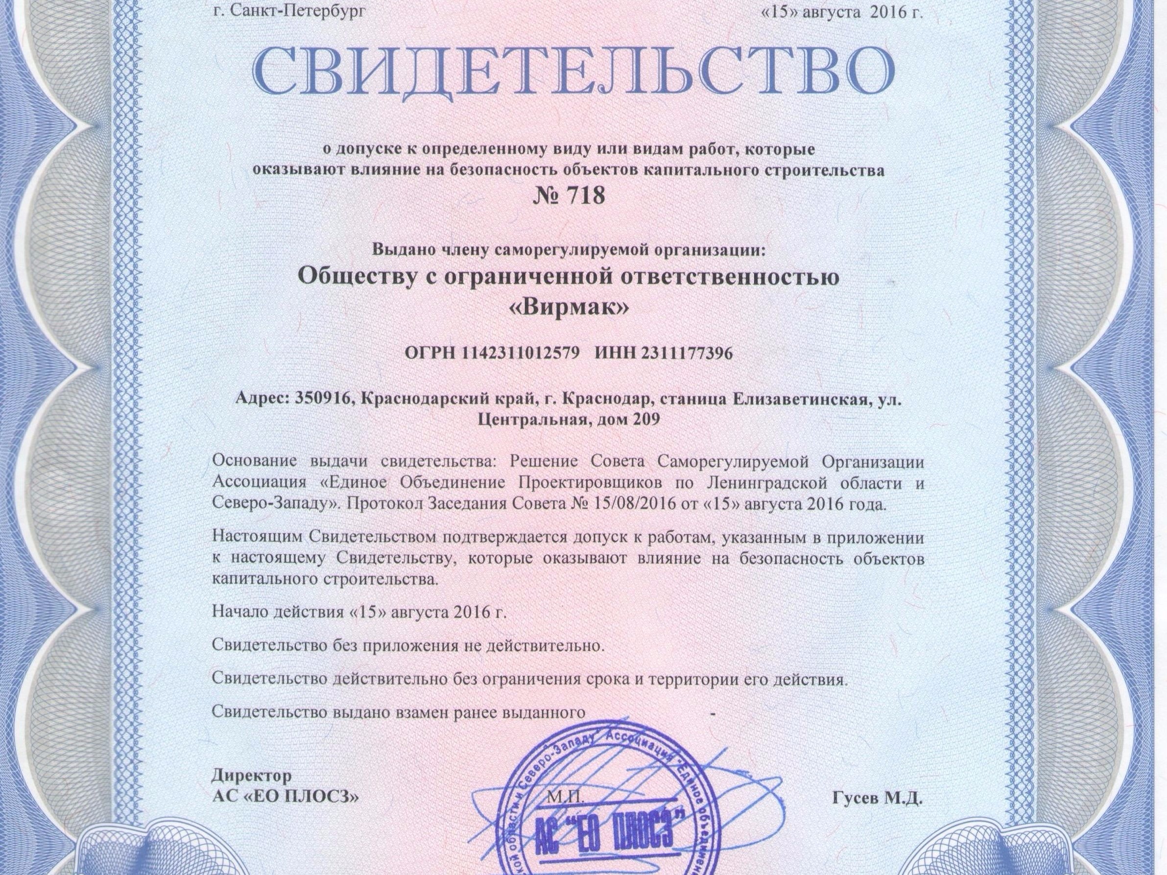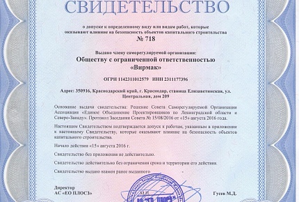 15 августа 2016 года компания ВИРМАК получила сертификат о допуске к определенному виду или видам работ, которые оказывают влияние на безопасность объектов капитального строительства