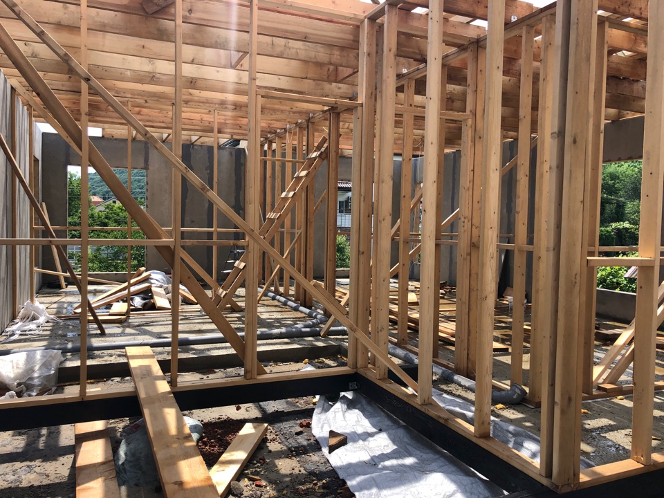 В межэтажных перекрытиях в качестве несущих лаг мы применяем двутавровые балки собственного производства с влагостойкой 24 мм. фанерой в сердечнике.