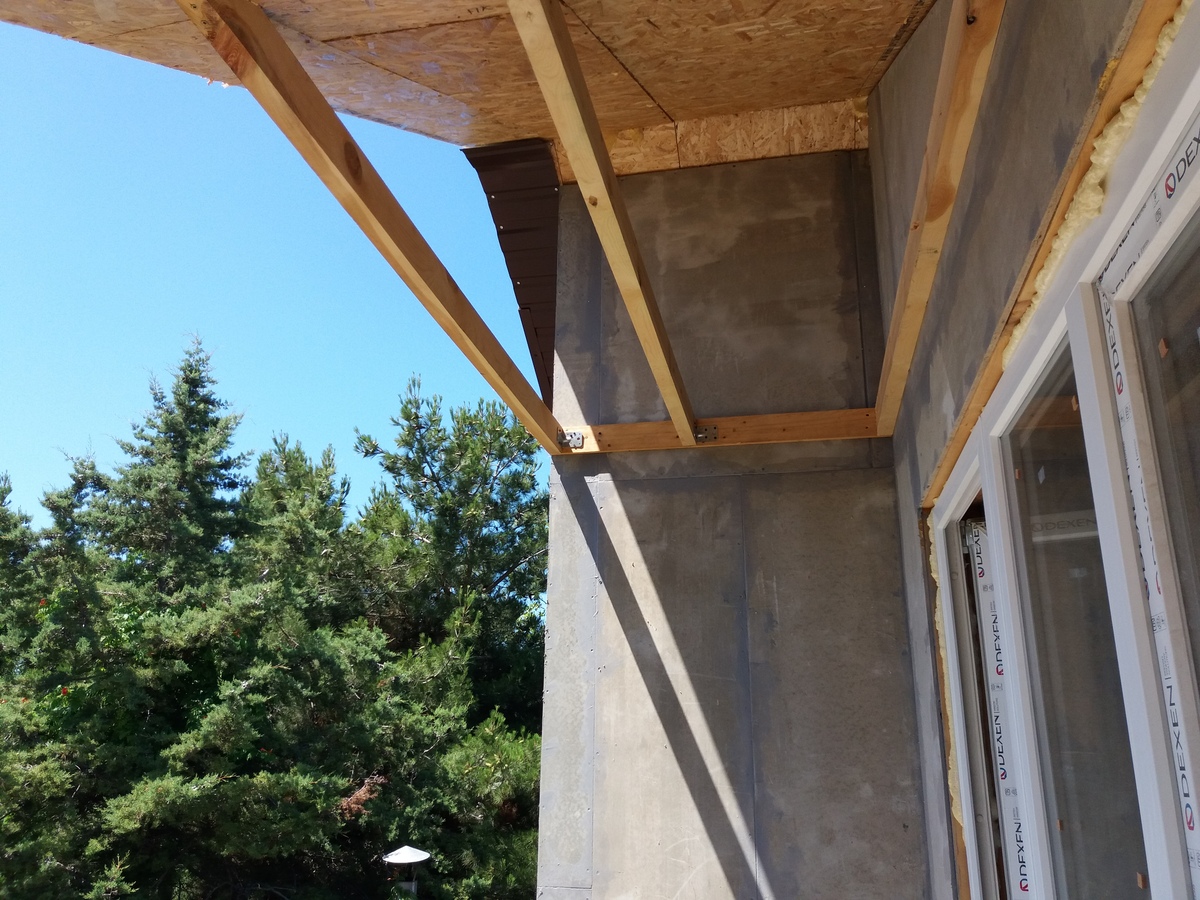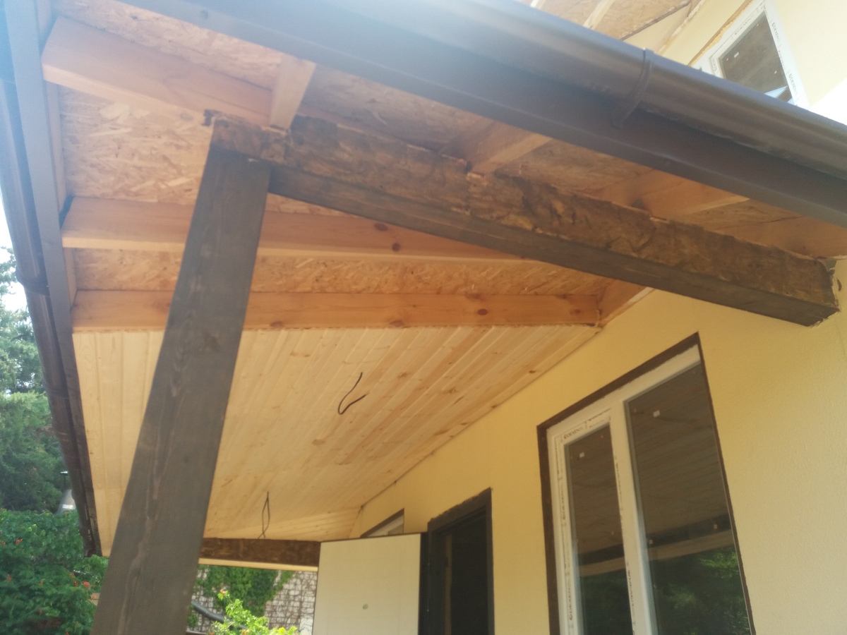 пиломатериал 1-го сорта естественной влажности, антисептированный (стропила 50*150 мм, обрешетка, поперечная обрешетка), пароизоляция А, D, утеплитель 150 мм, софиты (С-8 профиль), кровля - металлопрофиль (металлочерепица).