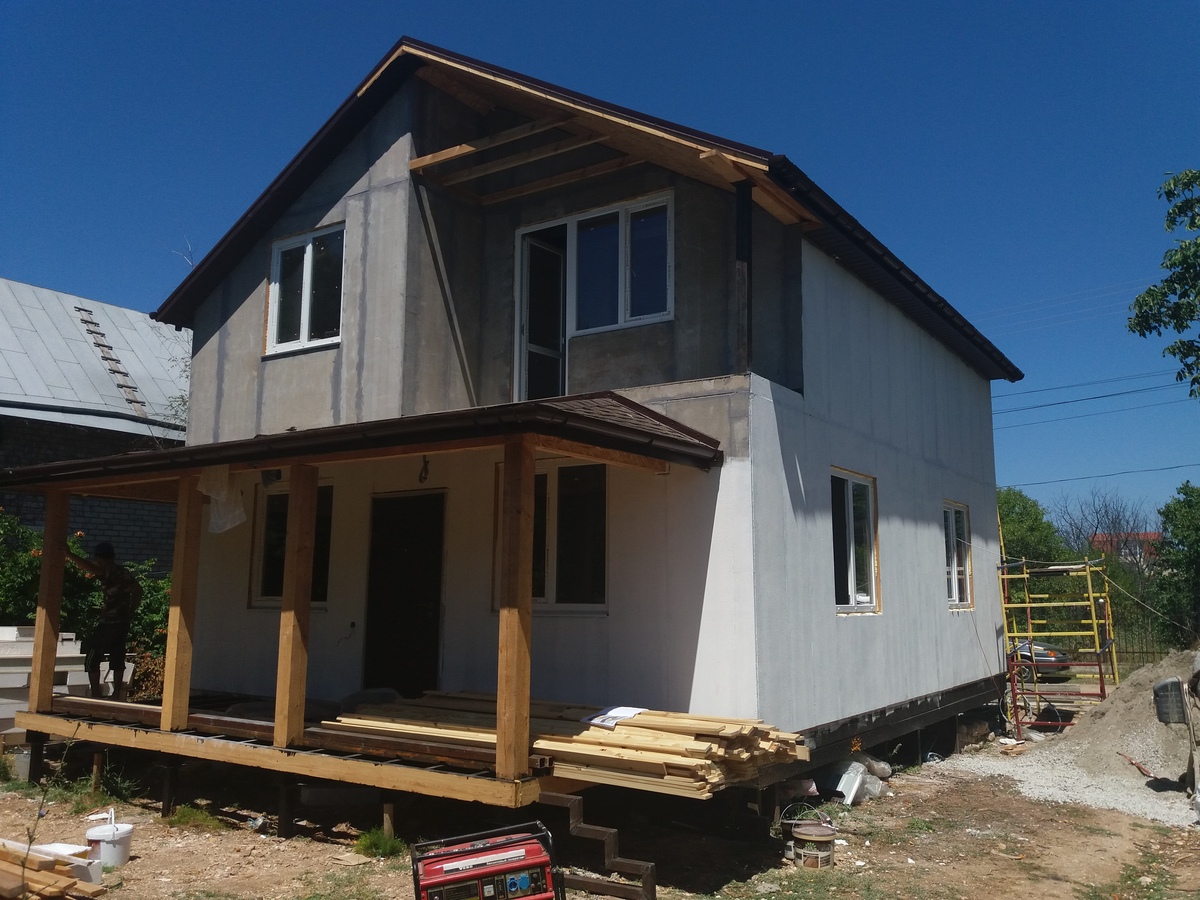 из СИП панелей из ЦСП размером 2700*1200*168 мм с антисептированным калиброванным пиломатериалом камерной сушки (46*140 мм). Монтаж каркасов несущих перегородок из пиломатериала 38*89 мм (76*89 мм).