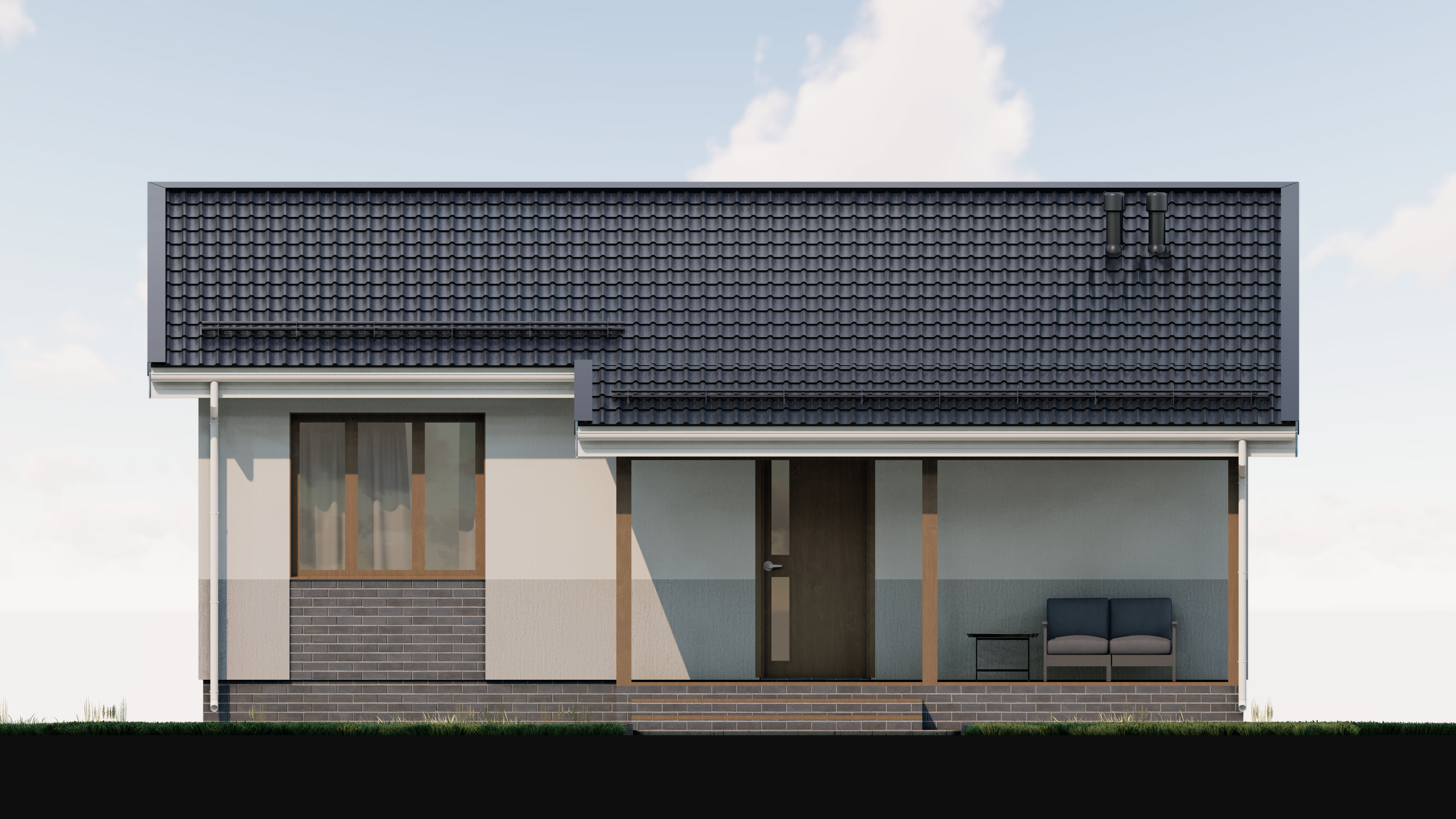 • Плоская или скатная утепленная кровля (пароизоляционная пленка, утеплитель вата на основе стекловолокна или базальта, гидро-ветрозащитная мембрана) с покрытием из металлочерепицы, полимерной мембраны или гибкой черепицы. (цена отличается от выбранного типа) (Ширина карнизного свеса от 30 см. Водосточная система в стоимость не входит