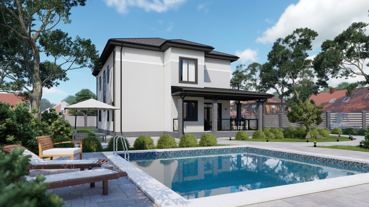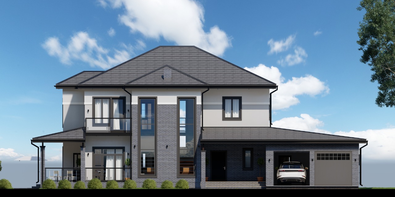 • Плоская или скатная утепленная кровля (пароизоляционная пленка, утеплитель вата на основе стекловолокна или базальта, гидро-ветрозащитная мембрана) с покрытием из металлочерепицы, полимерной мембраны или гибкой черепицы. (цена отличается от выбранного типа) (Ширина карнизного свеса от 30 см. Водосточная система в стоимость не входит