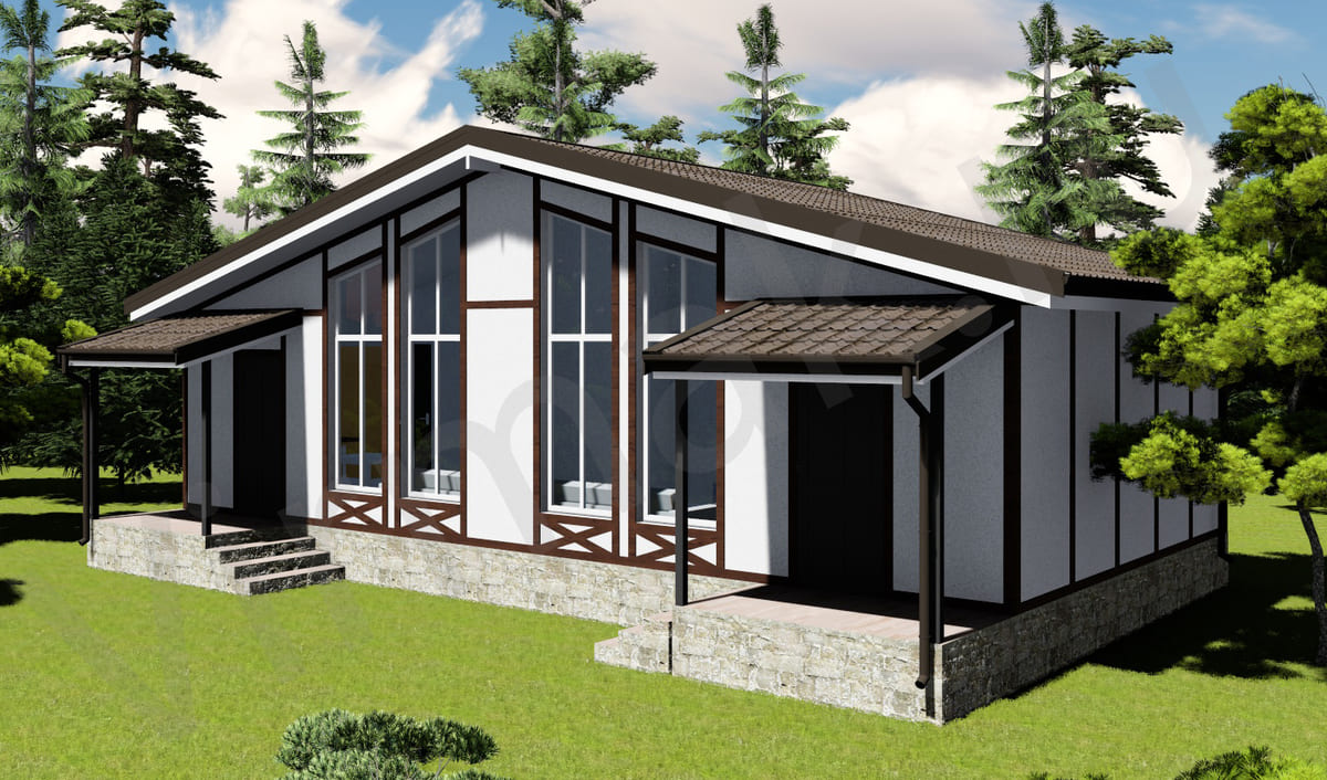 • Плоская или скатная утепленная кровля (пароизоляционная пленка, утеплитель вата на основе стекловолокна или базальта, гидро-ветрозащитная мембрана) с покрытием из металлочерепицы, полимерной мембраны или гибкой черепицы. (цена отличается от выбранного типа) (Ширина карнизного свеса от 30 см. Водосточная система в стоимость не входит