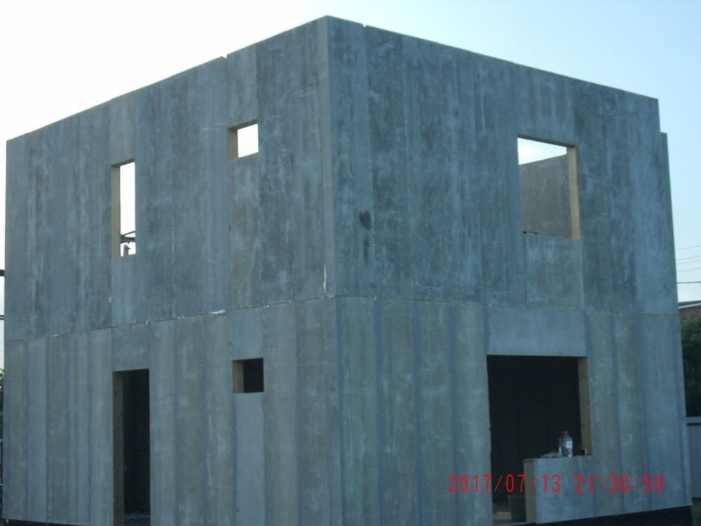 из СИП панелей из ЦСП размером 2700*1200*168 мм с антисептированным калиброванным пиломатериалом камерной сушки (46*140 мм). Монтаж каркасов несущих перегородок из пиломатериала 38*89 мм (76*89 мм).